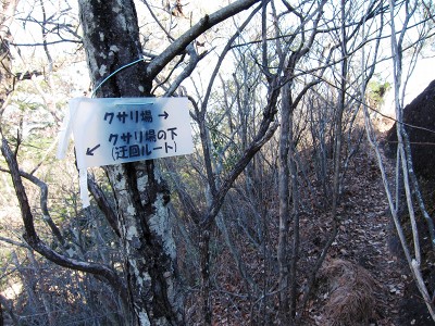 ←←鎖場を降りて先に進むと「迂回路」の看板。 これに従って右折する。 ←帰り道で振り返った岩山の連なり。右端辺りが猿岩。 |