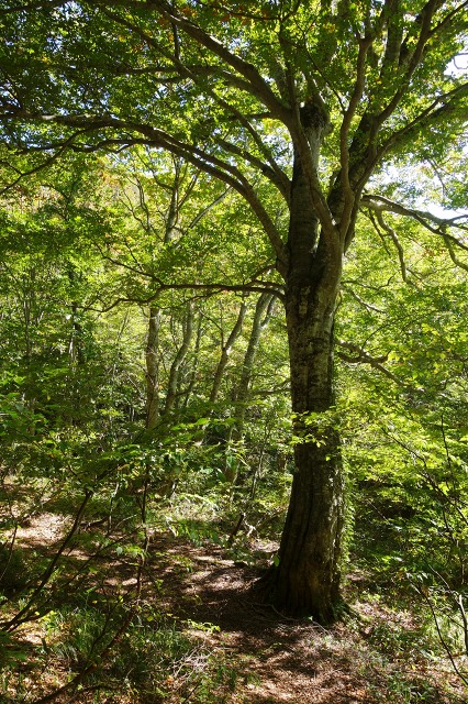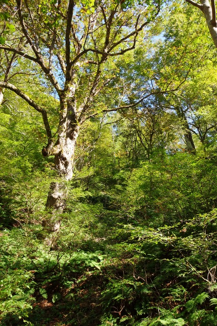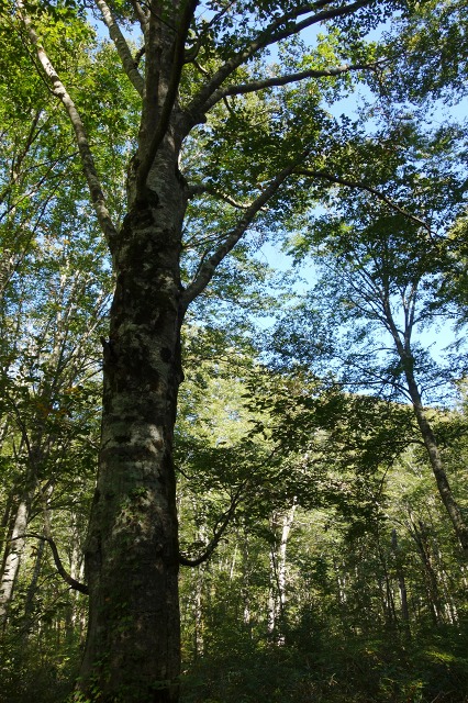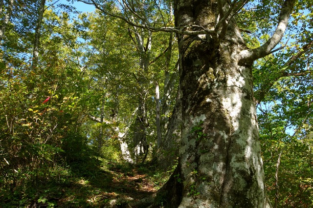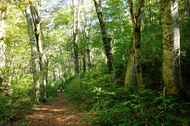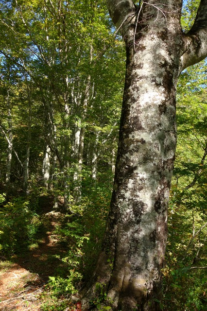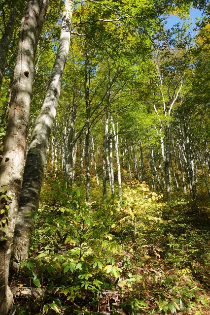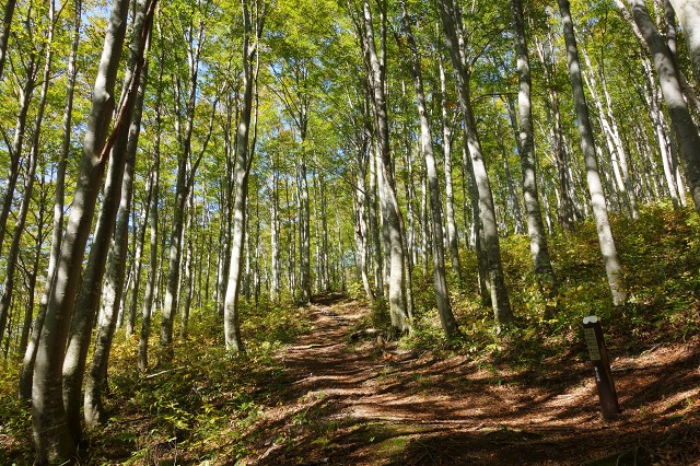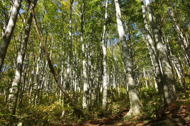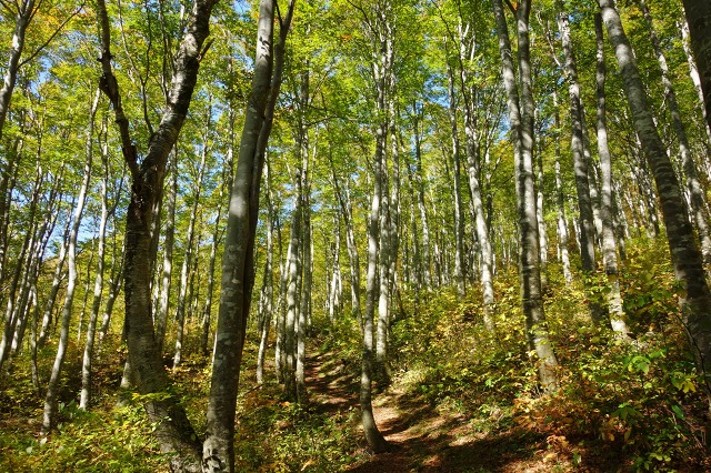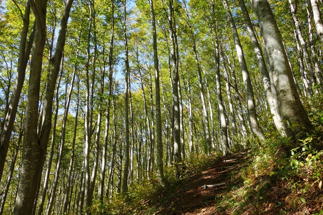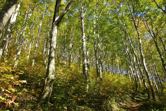 ![]() 峠近く、幹は細いが美しいブナの森が広がる |