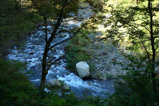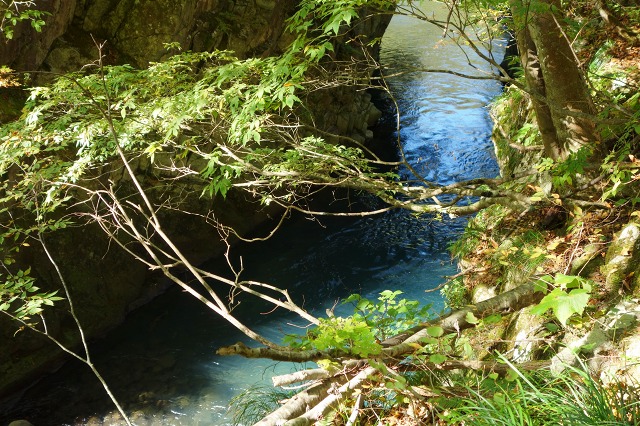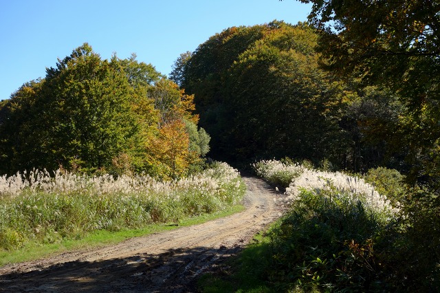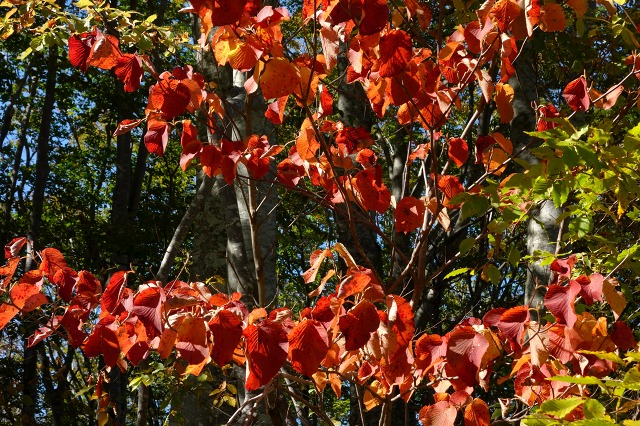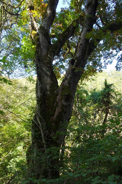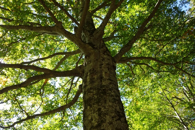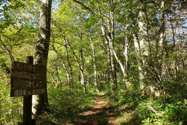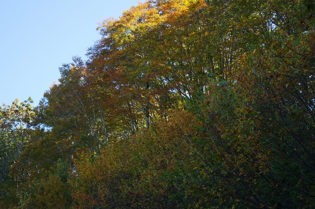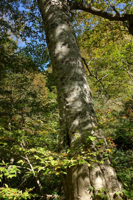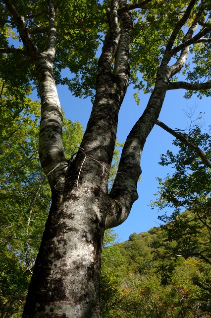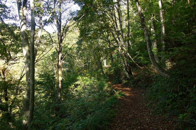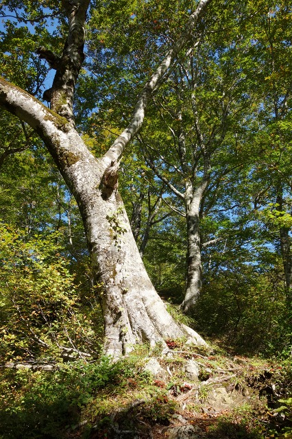 ![]() 峠近く、幹は細いが美しいブナの森が広がる |